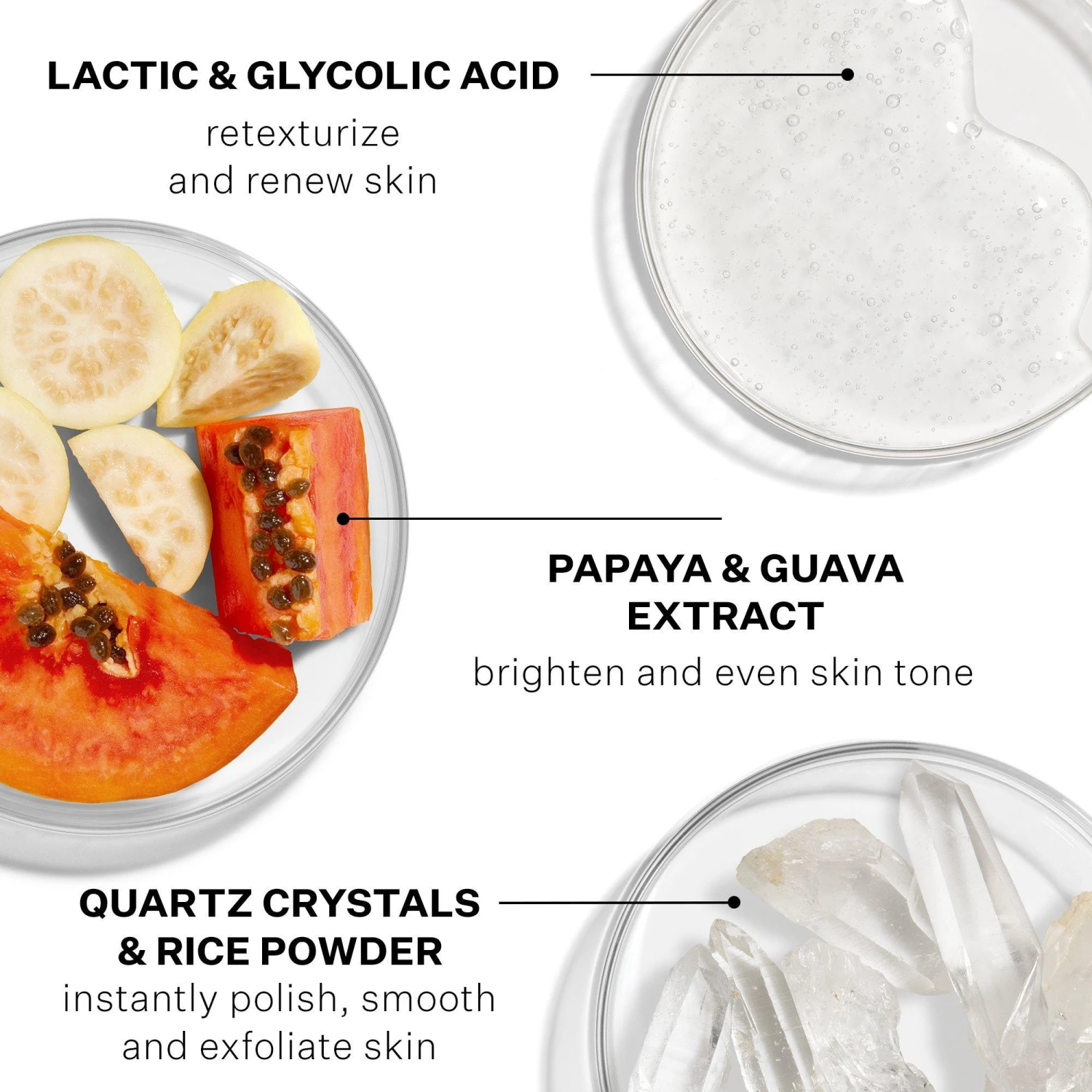 - Quartz Crystals & Rice Powder instantly polish, smooth and exfoliate skin