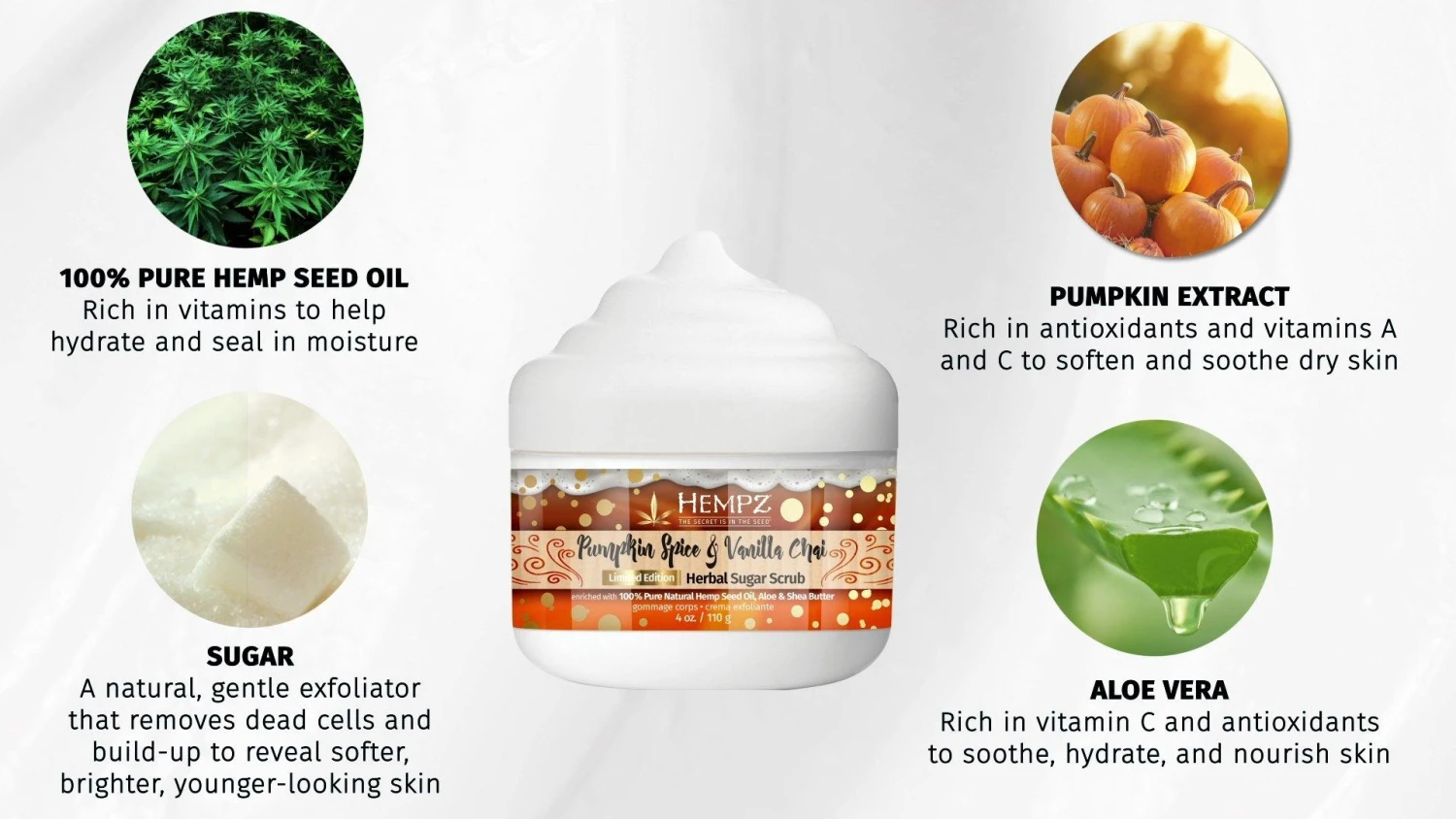 - Hemp Seed Oil – rich in omega fatty acids to protect skin and seal in moisture